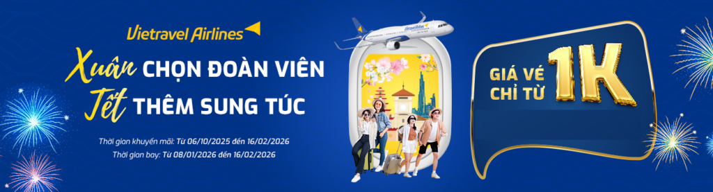Ưu đãi Tết 2026 Vietravel Airlines Vé 1.000đ Vietravel AirlinesVé chỉ 1.000đ đón Tết 2026 Nhân dịp khai trương đường bay mới Vinh – TP. Hồ Chí Minh, Vietravel Airlines triển khai chương trình ưu đãi đặc biệt với mức giá chỉ 1.000 đồng cho hành trình bay dịp Tết Nguyên Đán 2026. ĐẶT VÉ…